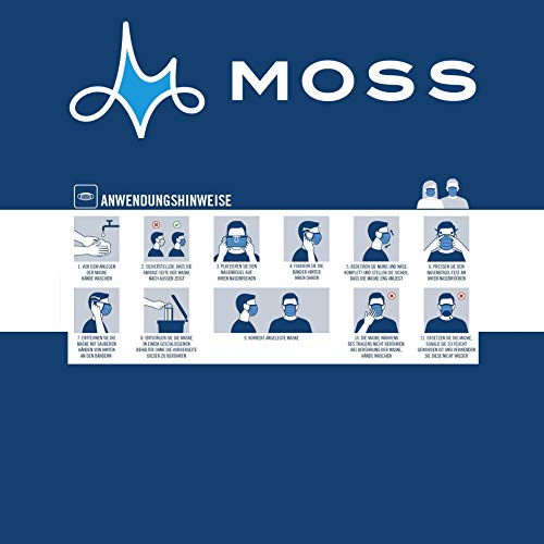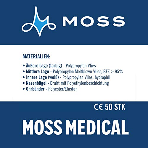 Moss 50 wegwerp-gezichtsmaskers gemaakt in Duitsland, mond- en neusbescherming met oorbanden, 3-laags