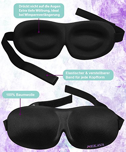 Specification: Nekava slaapmasker voor dames en heren. Premium 3D-slaapbril in zwart met gebogen vorm voor drukvrij oogcontact. Volledig donker, verstelbaar en comfortabel. Incl. oordopjes & reistas + gratis luisterspel: mysterieuze fantasie