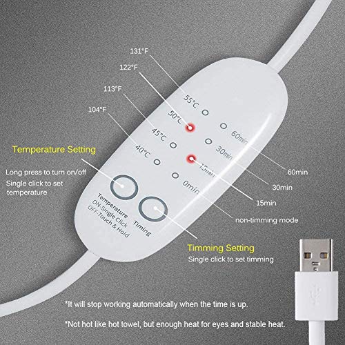 Instelbare temperatuur en timing: dit oogmasker heeft 4 temperatuurinstellingen van 40 °C, 45 °C, 50 °C, 55 °C (104 °F, 113 °F, 122 °F, 131 °F) en 4 timing-instellingen 0 min, 15 min, 30 min, 60 min. Gebruikers kunnen flexibel de juiste temperatuur en de warmteverpakking aan hun behoeften aanpassen.